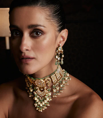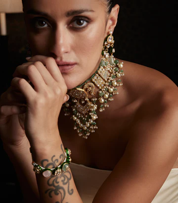 Elegant And Eye-catching, The Aayra Green Kundan Necklace Set Features Rich Green Stones Set In Timeless Kundan Artistry. Perfect For Festive Wear, Weddings, Or Celebrations, It Brings A Royal Touch To Your Traditional Look.