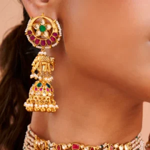 Radiating Tradition And Grace, The Diya Kundan Jhumka Features Intricate Craftsmanship With Sparkling Stones And Timeless Design. A Perfect Match For Festive Wear, It Adds A Touch Of Regal Charm To Every Look.