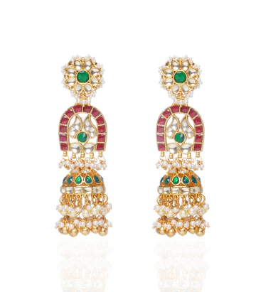 Cutting-edge elegance meets tradition in our Kundan Jhumkas. Gold-plated, adorned with red and green kundan, and featuring tiny pearl drops, these earrings capture the essence of undying sophistication with a modern twist.