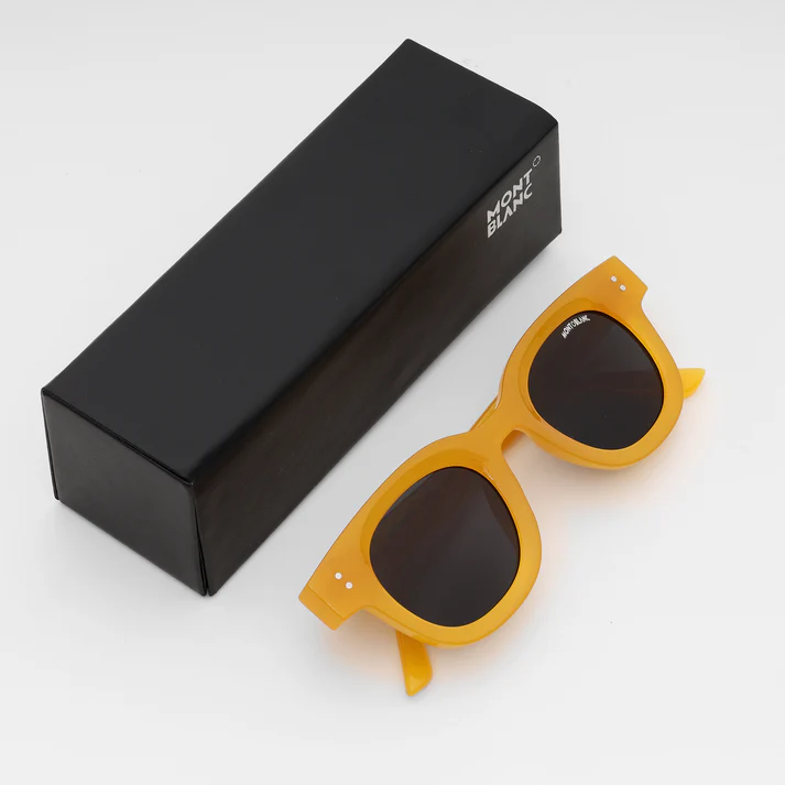 Montblanc Marigold Classic Round Sunglasses brighten up your look with their bold, matte yellow acetate frames paired with timeless black lenses. Finished with subtle metallic details on the front and Montblanc branding at the temples, this pair fuses playful color with elegant craftsmanship and comes with a signature Montblanc black case for everyday sophistication.